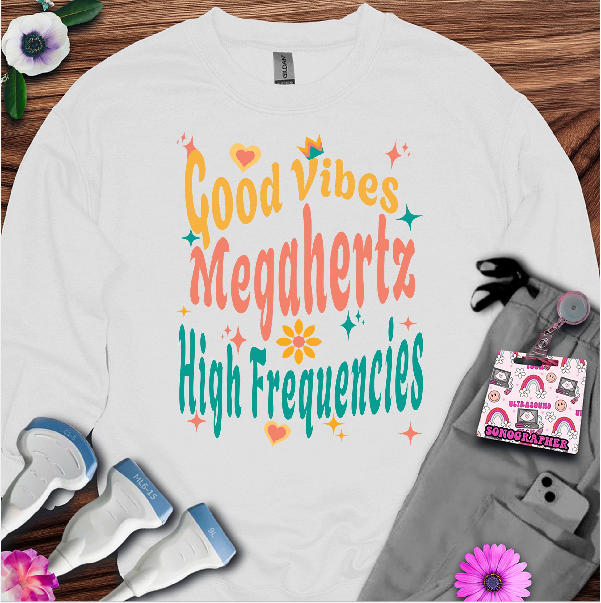 Show off your ultrasound pride with this fun ultrasound play-on-words 'Good Vibes, Megahertz, High Frequencies' Sweatshirt! The eye-catching design adds a pop of personality to your wardrobe, making it perfect for days at work or casual outings.